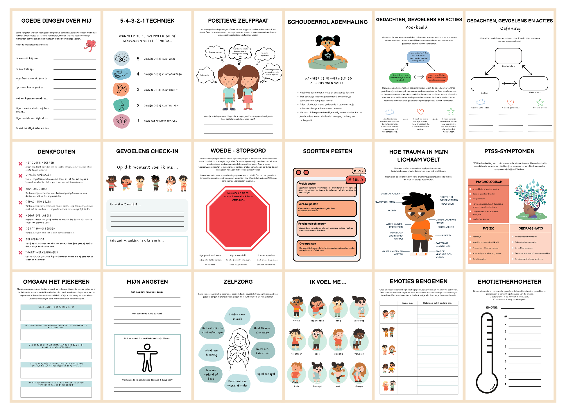 Deze bundel biedt zo’n duidelijk en praktisch kader. Je krijgt toegankelijke uitleg, herkenbare voorbeelden, ademhalingsoefeningen, concrete copingstrategieën en tientallen werkbladen die je meteen kan gebruiken. Voor kinderen voelt het overzichtelijk en haalbaar, voor begeleiders professioneel, stevig onderbouwd en klaar voor gebruik.