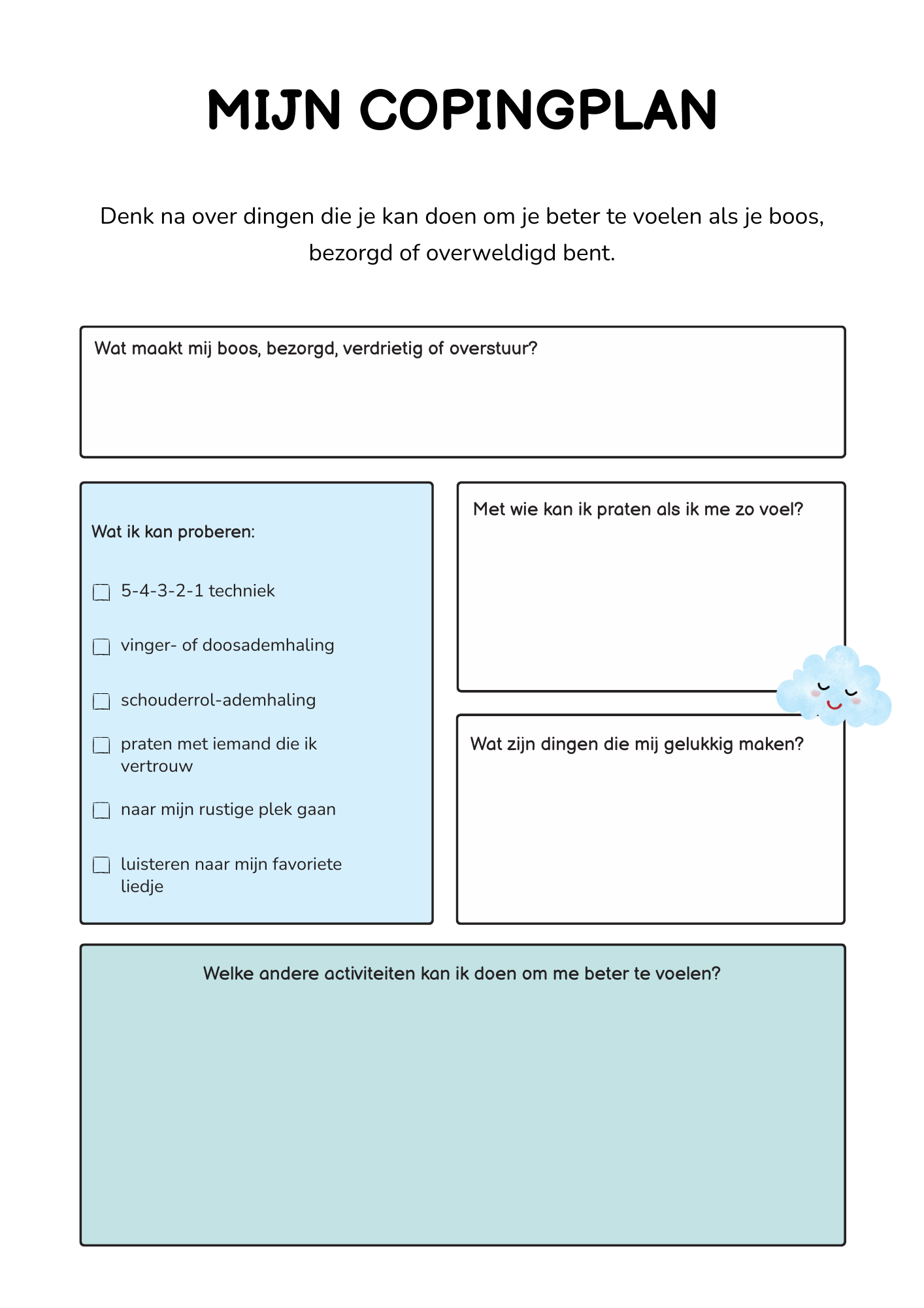 Deze bundel met 48 werkbladen helpt kinderen rust vinden in hun hoofd, woorden geven aan hun binnenwereld en stap voor stap vaardiger omgaan met spanning, piekeren en sterke gevoelens. Ook thema's als woede en trauma komen aan bod.