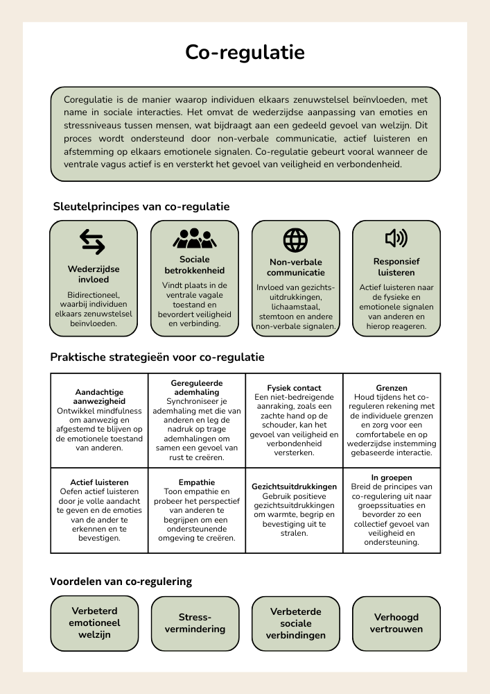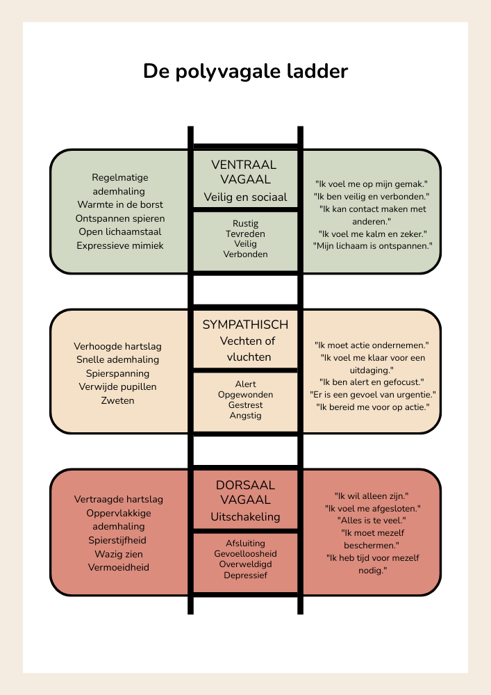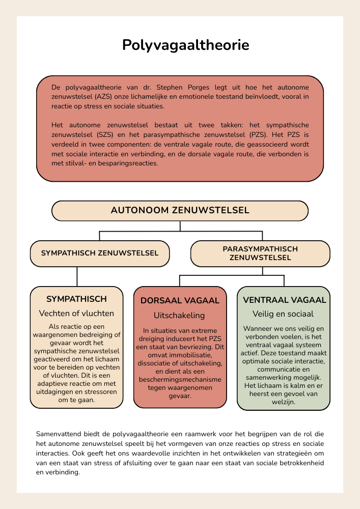 Wil je cliënten, leerlingen of jezelf beter begrijpen en kunnen helpen in momenten van stress, onrust of afsluiting? Dan is dit e-book iets voor jou. De Polyvagaaltheorie, ontwikkeld door dr. Stephen Porges, helpt ons te begrijpen waarom mensen op bepaalde manieren reageren — niet vanuit onwil of “moeilijk gedrag”, maar vanuit het zenuwstelsel dat veiligheid of gevaar waarneemt. Je ontdekt hoe kennis over de polyvagaaltheorie je kan helpen om meer rust, verbinding en veerkracht te ervaren én hoe je anderen hierin kan ondersteunen.